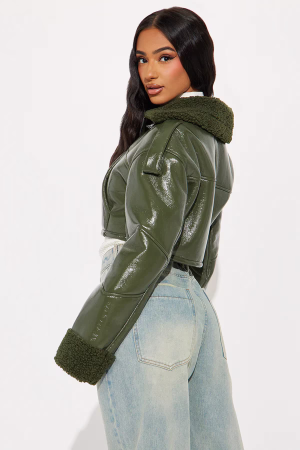 Bad Influence Faux Leather Cropped Jacket – Olive