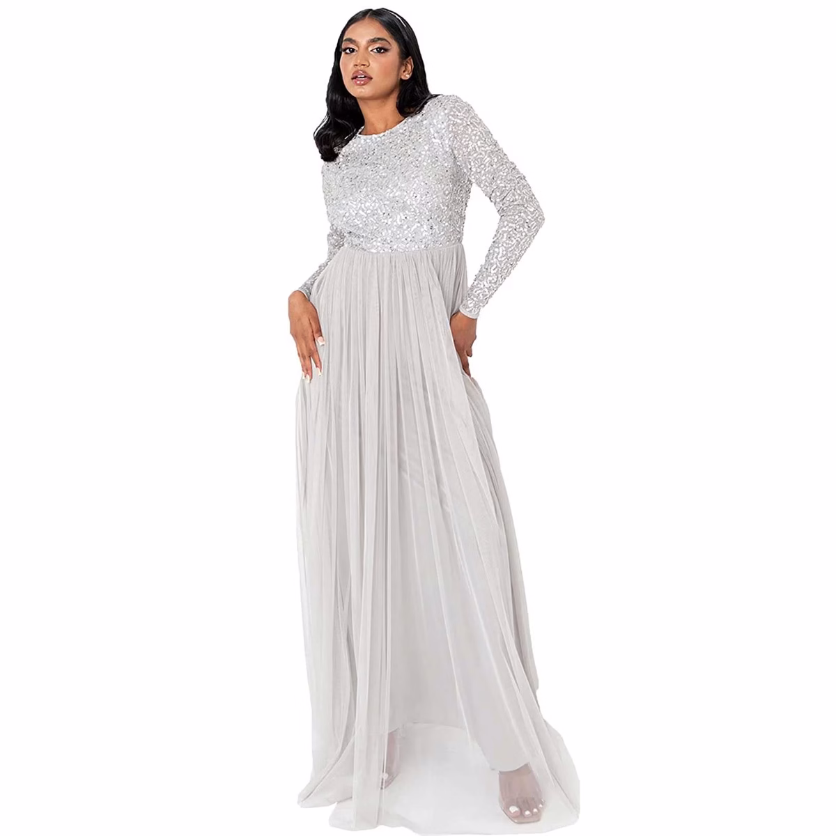 Presenting an adorable sequin-finished maxi evening dress designed to make a lasting impression. Available in 12 UK sizes (6–28) and a beautiful selection of colours including Blue, Sage, Bottle Green, Grey, Burgundy, Dusty Pink, Beige, and Pale Mauve, this dress is perfect for you and your bridesmaids. The elegant boat neckline is complemented by a floor-sweeping soft tulle skirt that gently flares from the waist, creating a romantic ball gown silhouette. The hand-sewn sequin-embellished bodice adds a subtle shimmer, ensuring a standout look for special occasions. Finished with an invisible zipper for a seamless fit, this dress combines timeless elegance with comfort.
